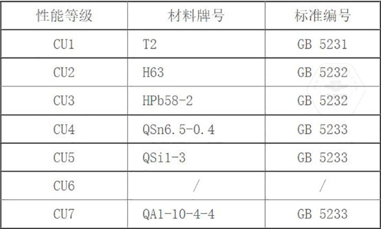 GB/T 3098.10標(biāo)準(zhǔn)中將銅制緊固件分為7個(gè)性能等級,標(biāo)記代號由字母及數(shù)字兩部分組成,即有色金屬化學(xué)元素字母加數(shù)字。其性能等級為CU1、CU2、CU3、CU4、CU5、CU6、CU7。標(biāo)準(zhǔn)中同時(shí)推薦了對應(yīng)性能等級選用的銅材料牌號。